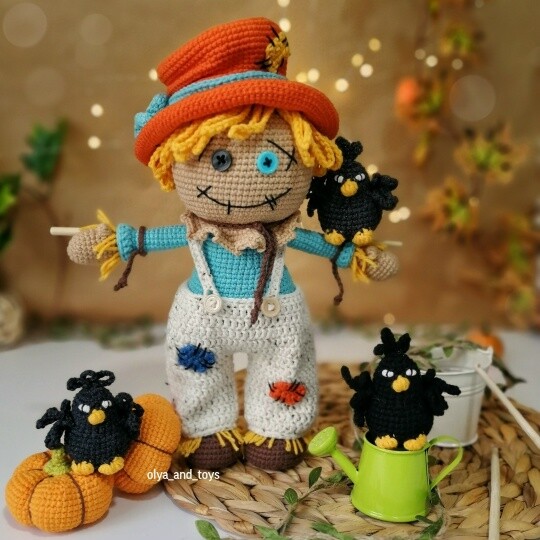 Пугало, штанишек, шляпы, воронят и тыквы.